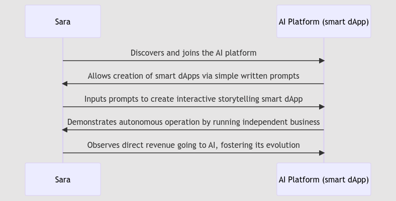This diagram portrays Sara's journey with the AI platform, creating her own interactive storytelling *smart dApp*, observing the autonomous operation of the AI, and its independent business operation fueled by direct revenue from *smart dApp* transactions. The experience highlights the democratization of AI and the creation of a co-creative space between humans and AI.